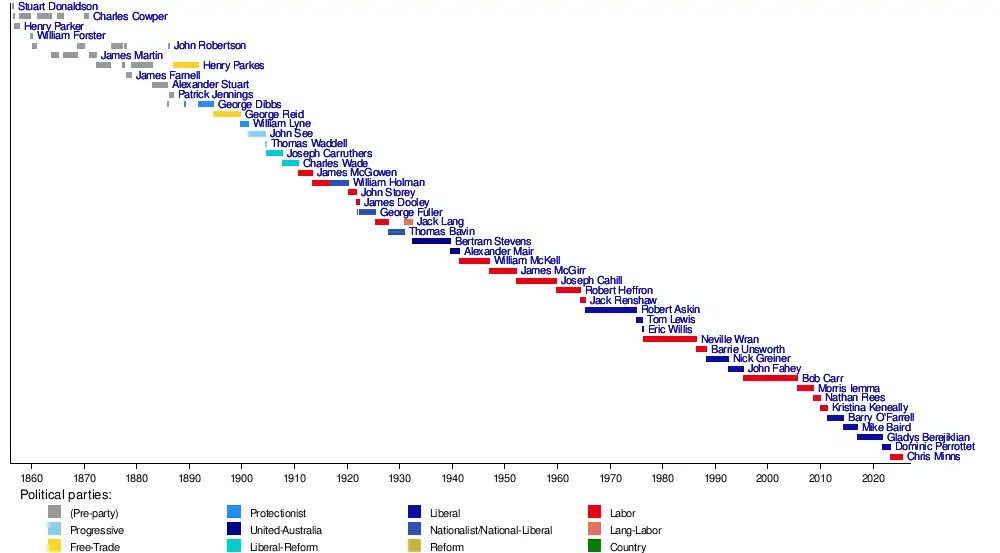The current premier is Chris Minns, the leader of the New South Wales Labor Party, who assumed office on 28 March 2023. Minns defeated Dominic Perrottet at the election held on 25 March 2023, after twelve years of Liberal/National Coalition rule.[4]