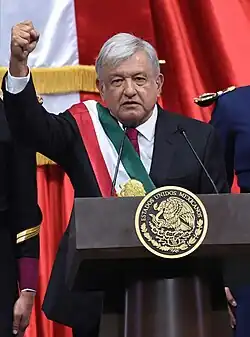 Andrés Manuel López Obrador's tenure as the President of Mexico began with his inauguration on 1 December 2018, and ended on 30 September 2024. López Obrador, a member of the National Regeneration Movement (MORENA) and former Head of Government of the Federal District, had previously run for president in the 2006 and 2012 elections. He assumed office following a landslide victory in the 2018 presidential election.[1] Upon his inauguration, he became the oldest person to hold the office since the change to a six-year term of office.[2]