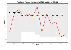 In season 2009, in the club's 50 year anniversary, Preston finished the season in 12th place and were relegated, just two seasons after being crowned VPL Champions. Makedonia managed just 7 points all season in what was one of the worst ever VPL seasons recorded.[6] Preston narrowly avoided relegation in 2010, finishing one point above the relegated FC Clifton Hill, qualifying to the relegation playoff against State League 2 side Diamond Valley United, winning the encounter 1–0 through a Robert Najdovski goal.[7]