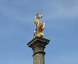 A war memorial, which commemorates the lives of local service personnel who died in the First World War, Second World War and the Spanish Civil War, stands near the town centre but is slightly obscured by the flanking buildings. It takes the form of a Scottish soldier in a Tam o' Shanter bonnet and greatcoat sculpted by William Birnie Rhind in 1921.[9]