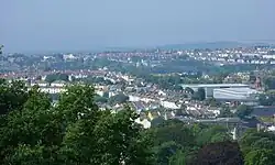 In this view from Tenantry Down, the suburb of Prestonville runs across the background below the skyline, and its position on the side of a high ridge is apparent.
