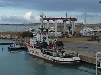 - 16 March 2018: a Libyan coastguard vessel intercepted the Open Arms[34] in international waters and threatened to "shoot to kill" unless the lifeguards handed over the women and children on board who were among the 218 people rescued earlier that day by the POA in international waters.[35][36] Open Arms had attended an alert sent out by the Italian coastguard's Italian Maritime Rescue Coordination Center (IMRCC)[37] to rescue two overloaded boats in difficulty.[38] After the POA had reached the boat carrying the migrants, IMRCC informed them that Libya forces had command over the operation, but "told the Open Arms crew to use their judgment".[37] A Libyan coastguard patrol boat reached the scene approximately 30 minutes after all the migrants had been issued with life jackets and all the women and children had been transferred to the POA's RHIBs.[37] Two days later, The Associated Press, quoting the Italian news agency Agenzia Nazionale Stampa Associata (ANSA), reported that the ship had been impounded by Italian authorities and its captain and two other people were being investigated for human trafficking after arriving in Pozzallo, Sicily with 216 of the 218 migrants they had rescued[39] in international waters, 73 miles (117 kilometers) from the coast of Libya.[40] Two of the people rescued, a mother and her sick child, had been evacuated to Malta,[41][40] where the ship is based, before Italian authorities permitted the ship to proceed to Sicily "given the precarious conditions of the migrants and worsening weather forecasts".[40]