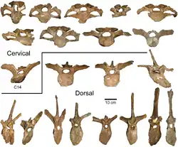 The holotype, MOR 2919, was found in a layer of the Judith River Formation dating from the Campanian and being between 79.8 and 79.5 million years old, plus or minus two hundred thousand years. It consists of a partial skeleton with skull, of an adult individual. It contains the right premaxilla, both maxillae, the left jugal, a part of the right lacrimal, the rear of a left nasal bone, the middle part of a right nasal bone, the skull roof from the frontal bones to the exoccipitals, both squamosals, both quadrate bones, the predentary of the lower jaws, both dentaries, a right surangular, eleven neck vertebrae, eleven back vertebrae, twenty-nine tail vertebrae, nineteen chevron bones, nineteen ribs, the entire pelvis, both lower legs, a right second metatarsal and a right fourth metatarsal. The bones have not been found in articulation.[2]