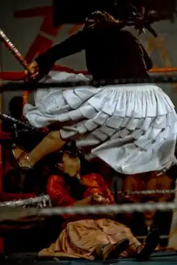 Professional wrestling shows can be considered a form of theater in the round, with the ring, ringside area, and entryway comprising a stage.[84] There is less of a fourth wall than in most theatric performances; like pantomime, audience involvement is expected and encouraged. Attendees are recognized and acknowledged by performers as spectators to the sporting event being portrayed and are encouraged to interact as such; their reactions can dictate how the performance unfolds, leading to a high level of audience participation.[85] Often, individual matches will be part of a longer storyline conflict between "babyfaces" (often shortened to just "faces") and "heels". "Faces" (the "good guys") are those whose actions are intended to encourage the audience to cheer, while "heels" (the "bad guys") act to draw the spectators' ire.[86]