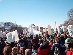 Many of the protests were said to be smaller than those in the same cities a month ago; exceptions were Montreal, which upped its turnout to 200,000 and Dublin where 130,000 demonstrated. The Montreal turnout may have been related to solidarity against American anti-French sentiment, which was a common theme for many of the protesters.[37] A further 15,000 protested in Quebec City.[38] 55,000 protested in Paris, and 4,500 to 10,000 in Marseille. 100,000 protested in Berlin, some 20,000 protested in Athens, close to 10,000 people marched in Tokyo, and tens of thousands in Washington, D.C. Organizers claimed between 30,000 and 45,000 people turned out, while The Oregonian and the Associated Press estimated between 20,000 and 25,000 people attended, closer to the number in Portland who participated in the January 18 protest.[39] Thousands more marched in cities worldwide including Bangkok, Seoul, Hong Kong, Amman, Chicago, Calcutta, Melbourne, Christchurch, Dunedin, Paris, London, Portsmouth, Leeds, York, Exeter, Newcastle upon Tyne, Frankfurt, Nuremberg, Zurich, Copenhagen, Stockholm, Nicosia, Monaco, Santiago, Havana, São Paulo, Buenos Aires, Moscow, Seattle, Chicago, San Francisco, Los Angeles, Atlanta, Vancouver, Halifax, Ottawa, and Toronto, as well as cities in Yemen, Turkey, Israel, and the Palestinian territories.[37][40][41][42][43][44]