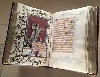 The Psalter of Bonne de Luxembourg is a small 14th-century illuminated manuscript in tempera, grisaille, ink and gold leaf on vellum.[1] It was probably commissioned for Bonne de Luxembourg, Duchess of Normandy, daughter of John the Blind and the wife of John II of France, probably at the end of her husband's life, c 1348–49. At the time illuminated manuscripts could compete with monastic scriptoria and panel painting as commercially attractive donor portraits. Bonne died of plague in 1349.