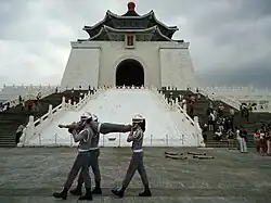 An honor guard, or ceremonial guard, is a ceremonial unit, usually military in nature. Public Movement, with the Veterans Honor Guard of R.O.C. held a weekly ceremonial performance at the Chiang Kai-Shek Memorial Hall in Taipei, Taiwan. This performance was shown to the public throughout the Asian Art Biennial. The audience members were encouraged to use this performance as a means of connecting to and exploring the history and future of Taiwan - a nation free of international recognition, that can thus dance its unspoken trauma, myth and heritage, examine the notion of independence, and acknowledge its violence and unity. Honor Guard was Public Movement's first action in East Asia.[14]