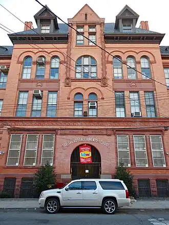 Public School 108 is a historic school building located in Cypress Hills, Brooklyn, New York, New York. It was designed by James W. Naughton and built in 1895. It is a three-story, brick building trimmed in Lake Superior sandstone in the Romanesque Revival style. It has an attic fourth floor pierced by dormer windows. It consists of a seven bay central section connected to three bay wide end pavilions by recessed wings.[2]