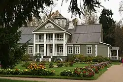 The district contains thirty-two cultural heritage monuments of federal significance and additionally forty-two objects classified as cultural and historical heritage of local significance.[14] The majority of the federally protected monuments are grouped in and around the Mikhaylovskoye Museum Reserve, a large museum complex located in Pushkinskiye Gory and the surrounding villages. The complex is devoted to Alexander Pushkin, a Russian 19th century national poet, who owned an estate in the village of Mikhaylovskoye and spent there considerable periods of his life. He was buried in Svyatogorsky Monastery in what is currently Pushkinskiye Gory. Other monuments are archeological sites.