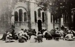 Delegates of the 6th plenary session of the 6th Central Committee of the Chinese Communist Party, including Mao Zedong (left end) and Zhou Enlai (right end), posing outside the church in 1938. The Romanesque Revival arch doorway is visible.
