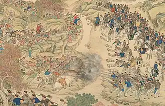 The frontier in the south-west was extended slowly. In 1701 the Qing defeated Tibetans at the Battle of Dartsedo. The Dzungar Khanate conquered the Uyghurs in the Dzungar conquest of Altishahr and seized control of Tibet. Han Chinese Green Standard Army soldiers and Manchu bannermen were commanded by the Han Chinese General Yue Zhongqi in the Chinese expedition to Tibet (1720) which expelled the Dzungars from Tibet and placed it under Qing rule. At multiple places such as Lhasa, Batang, Dartsendo, Lhari, Chamdo, and Litang, Green Standard troops were garrisoned throughout the Dzungar war.[14] Green Standard Army troops and Manchu bannermen were both part of the Qing force who fought in Tibet in the war against the Dzungars.[15] It was said that the Sichuan commander Yue Zhongqi (a descendant of Yue Fei) entered Lhasa first when the 2,000 Green Standard soldiers and 1,000 Manchu soldiers of the "Sichuan route" seized Lhasa.[16] According to Mark C. Elliott, after 1728 the Qing used Green Standard Army troops to man the garrison in Lhasa rather than bannermen.[17] According to Evelyn S. Rawski both Green Standard Army and bannermen made up the Qing garrison in Tibet.[18] According to Sabine Dabringhaus, Green Standard Chinese soldiers numbering more than 1,300 were stationed by the Qing in Tibet to support the 3,000 strong Tibetan army.[19] Garrisoned in cities, soldiers had few occasions to drill. The Qing nonetheless used superior armament and logistics to expand deeply into Inner Asia, defeat the Dzungar Mongols in 1759, and complete their conquest of Xinjiang. Despite the dynasty's pride in the Ten Great Campaigns of the Qianlong Emperor (r. 1735–1796), the Qing armies became largely ineffective by the end of the 18th century.