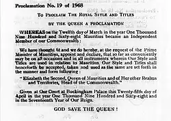 • 25 April 1968 – 12 March 1992: Elizabeth the Second, Queen of Mauritius and of Her other Realms and Territories, Head of the Commonwealth[9][10][11]