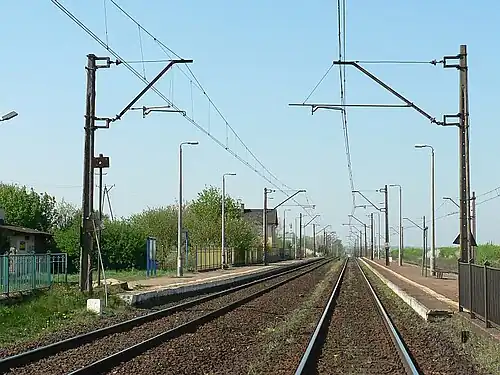 Różyny railway station is a railway station serving the village of Różyny, in the Pomeranian Voivodeship, Poland. The station is located on the Warsaw–Gdańsk railway and the train services are operated by Przewozy Regionalne.