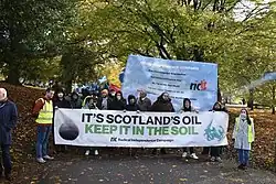 In late April 2021 it was reported that the group was "alive" and preparing for a potential second Scottish independence referendum.[15][16] Hustings were organised in the run-up to the May 2021 Scottish Parliament election.[17] An online Radical Independence Conference was held in June 2021, offering workshops on planning acts of civil disobedience to pressure the UK Government.[18][19][20][21][22] During the UN COP26 climate change conference in Glasgow, on 6 November, RIC organised the independence bloc of the Global Day of Action for Climate Justice march, which was the city's largest protest in nearly two decades.[23] The group organised under the slogan “It’s Scotland’s oil, keep it in the soil”. RIC also used COP26 as an opportunity to network with self-determination activists from other stateless nations which were excluded from the official UN conference.[23]