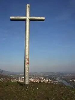 Radobýl (German: Radebeule) is a basalt hill in Central Bohemian Uplands in the Czech Republic. It has an altitude of 399 m (1,309 ft) and is located in the Ústí nad Labem Region, on the border between the territories of Žalhostice and Litoměřice. It rises above village of Žalhostice on right bank of the Elbe River. Part of the hill with abandoned basalt quarry and rich rock steppe flora is under protection as Radobýl Nature Monument. The hill is a popular hiking destination. From huge metallic cross (erected in 1991) on the bare summit there is almost 360-degrees panoramic view of central part of the Central Bohemian Uplands, Litoměřice, Terezín and Lovosice.