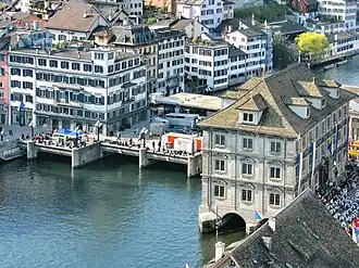 The first extensions of the medieval wooden bridge were carried out in 1375 and 1420/21. The medieval bridge was wider than necessary, and housed the mills of the Oetenbach Nunnery, as shown by the altarpiece of the Grossmünster Zwölfbotenkapelle by Hans Leu. Only the breakwaters at the inflow side were built of stone, which can be seen on the Murerplan. All other sections of the bridge consisted mostly of wood. As Schipfe expanded, it became necessary to expand the bridge to accommodate the new traffic. From 1602 to 1605 the bridge was rebuilt with the present dimensions. the bridge was bound on the east by the former Hotel Zum Schwert (now a commercial building), and in the west with a wooden platform made of oak planks. The bridge section between the town hall and the Hauptwache was rebuilt from stone. From 1881 to 1893, the remaining wooden bridge was replaced by a cast-iron construction. The old stalls and shops were slowly replaced by modern commercial buildings, including a café and sanitary installations.[3] In 1972, it once again became necessary to rebuild the bridge. The new design, made of reinforced concrete, was designed by the architect Manuel Pauli and completed in 1973.
