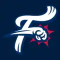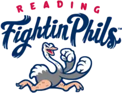 The team colors of the Reading Fightin Phils are Phillies red, nighttime navy, cream, and white. Their logo consists of a white and gray ostrich outlined in blue with flesh-colored beak and legs putting up his fists in a fighting stance, with the red block "READING" and blue script "Fightin Phils" wordmark right above it. There is also an alternate logo with said ostrich's upper body in a blue circle outlined in red, surrounded by a red burst and "READING" and "PENNSYLVANIA" tilted near the top and bottom, respectively.