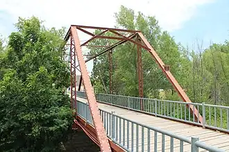 It is a 5-panel, pinned Pratt through-truss bridge with I-beam approach spans. It is 112 feet (34 m) in total length, with the primary span 80 feet (24 m) in length.[2]