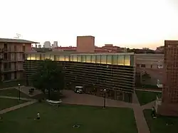 Wiess Hall was completed in 1949, but carried the name "North Hall" until its dedication in March 1950.[50] It was laid out as a W-shaped building, with three north–south wings, joined on the north ends by a long east–west spine, forming two open quadrangles.[51] The building was two stories high except for the three-story center wing. The hall was designed to house about 200 students in 20 single and 90 double rooms. Each room at Wiess opened directly to an exterior walkway that wrapped around the entire building. This design incorporated two features that were innovative at the time: every room had a semi-private bathroom and every room (except room 228, which was reserved for freshmen) had windows on at least two sides—an important adaptation in the years before air conditioning.[52]