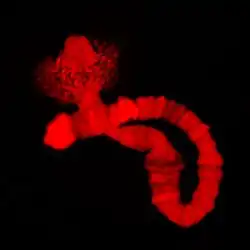 Rhynchosciara americana is a species of fly. It has a life cycle of approximately 70 days, and the sibling larvae show a synchronized development. The larvae can reach one inch in length, and the adult fly is about 0.8 inch (20 mm). The larvae groups are usually originated from the same female posture and spin a communal cocoon where the metamorphosis will occur. The fly is scientifically notable for the physiology of its polytene chromosomes and developmentally regulated amplified puffs, first observed by Crodowaldo Pavan.