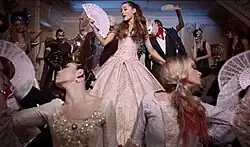 Grande wearing a pink dress in a masqueraded, costume Victorian-era inspired party while surrounded by party guests during the music video (as illustrated above).