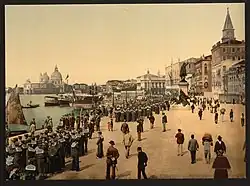 During Austrian rule, in 1851 Alderman Bembo presented a plan for the construction of a city bathing establishment in San Marco Basin. The project, commissioned from the architects Fisola and Cadorin, called for the doubling in width of the Schiavoni bank, with the construction of a second row of buildings, for the time modern, facing the San Marco basin, as well as the doubling of the Ponte della Paglia, Ponte del rio di Vin, Ponte dei Greci and ponte della Ca' di Dio bridges. The project, highly controversial because of its very heavy impact, was later finally rejected in 1854 by the provincial delegate.[3]