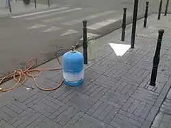 Preformed thermoplastic pavement markings (sometime called "tape", but not to be confused with preformed polymer tape) are thermoplastic cut into the final shapes by the manufacturers and ready to position onto an asphalt or concrete pavement surface. Preformed thermoplastics are put into place on the road surface and applied using a propane heat torch. Some models require heating the road surface prior to the placement of the preformed thermoplastics. These markings are used primarily because of their durability and cost-effective service life. Since the plastics are melted into the surface, they are not easily damaged by snowploughs. Typically, the preformed thermoplastic markings can last 3 to 6 years. The most common applications of preformed thermoplastic pavement markings are found at intersections as transverse markings such as stop lines, legends, crosswalks, arrows, bike lane symbols, and accessibility symbols.[12][13]