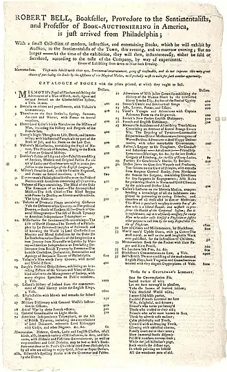 Robert Bell (1732–1784) was a Scottish immigrant to the British colonies in America and became one of many early American printers and publishers active during the years leading up to and through the American Revolution. Bell became widely noted for printing Thomas Paine's celebrated work, Common Sense, a highly influential work during the revolution that openly criticized the British Parliament and their management and taxation of the British-American colonies. Bell and Paine later had a falling out over profits and publication issues.[1][2] As a dedicated patriot, Bell printed many pamphlets and books before and during the revolution, many of which "glowingly" expressed his patriotic views.[3] He also reprinted a number of popular English works, presenting them to the colonies for the first time. He ran an auction house which sold rare books in Lancaster, and in later life he toured the colonies selling off his massive book collection.[3][4] After Bell's death, his printing press and other items were sold at a Philadelphia auction house to another prominent printer at an unusually high price.[5][6]