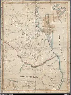 Having failed to gain reinstatement, Dixon moved to Moreton Bay. During that year, Dixon, with assistant surveyors Granville Stapylton and James Warner, began a trigonometrical survey of Moreton Bay for the Government to facilitate free settlement.[6] A baseline of 3 miles (4.8 km) was measured on Normanby Plains (today's Harrisville, south of Ipswich) as a foundation for the triangulation. Dixon was instructed to compile a plan of the district for land sales and town reserves.[7][8] This angered Governor Sir George Gipps.[9]