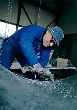 In 2001, Cordone designed a large-scale, outdoor monumental sculpture Movimento Ellissoidale, which stands in shallow water in front of the ARAG Tower in Düsseldorf.[10] Made from an alloy of aluminum and titanium, its high sail-like vertical form creates a five-ton wind-kinetic sculpture. An offset center of gravity, with an "inner pivot and self-aligning bearings, as used in shafts driven by a ship’s propeller, allows the large sculpture to maneuver freely like a sailing ship.”[11] Whether large gusts or gentle winds, the sculpture nautically corrects “in the wind."[11]