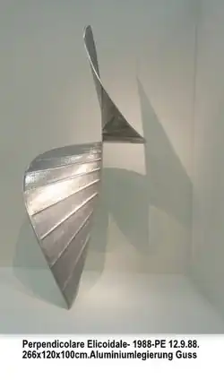 The Elicoidali sculptures are the "logical result of long artistic work” from the single vertical axial Perpendiculari to sculptures able to freely move in a room, changing their axis as they move.[2] No longer suspended or standing in a fixed place, the Elicoidali represent a "new design principle and a remarkable breadth of variation" in the inventory of forms.[1] They appear to constantly change shape as they move. By reducing their plastic volume, they receive an optical lightness despite the heaviness and hardness of the material, which seem to make them independent of the laws of gravity.[7] According to Vitt, Cordone “succeeds in dematerializing the mass of these sculptures to a high degree.”[4] As the Elicoidali are rolled, their edges form a continuous helicoid, or spiral, on the surface, whereby the three-dimensional sculptures appear projected on a plane.