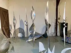 The Vertikali sculptures were conceived for the outdoors, anchored to the earth, often in correspondence with the surrounding architecture.[5] They are stainless steel sculptures, larger than life, built by using segments of cylinders and spheres welded together in symmetrical or asymmetrical relationships.