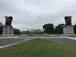 The Parkway has two points of origination on its southern end, one at the traffic circle around the Lincoln Memorial, and the other at the intersection of Ohio Drive and Independence Avenue. The eastern portion of the Lincoln Memorial traffic circle has been closed for several years, and there is no longer any easy access to the northbound parkway from that point. The Ohio Drive branch is now the main originating branch. Before the Theodore Roosevelt Bridge (I-66) was built, Constitution Avenue ran to the parkway, with Ohio Drive ending at Constitution Avenue.[1] The parkway's entrance is framed by two monumental statues, Music and Harvest and Aspiration and Literature, which together form a group known as The Arts of Peace. They were designed by James Earle Fraser and erected in 1951.[5][6]