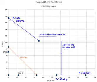 In comparison, the maximum thrust of the Rolls-Royce Pegasus 11-61/F402-RR-408, the most powerful version which is used in the AV-8B, is 23,800 pounds-force (106 kN).[19] The weight of the AV-8B is about 46% of the weight of the F-35B.