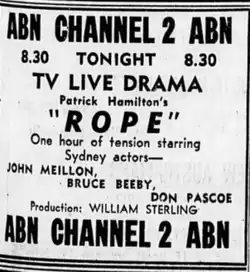 Rope is a 1957 Australian television film based on the play Rope by Patrick Hamilton. It was presented in real time.[3][4]