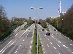 Elevated route for motorway and subway near Niddapark, facing Ginnheim; Europaturm tower on the left.