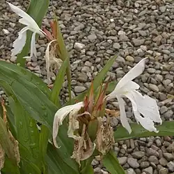 Like all members of the genus Roscoea, it dies back each year to a short vertical rhizome, to which are attached the tuberous roots. When growth begins again, "pseudostems" are produced: structures which resemble stems but are actually formed from the tightly wrapped bases (sheaths) of its leaves.[2] R. × beesiana is usually 48–60 cm tall, with seven to nine leaves, of which at most the lowest one consists only of a sheath. Each leaf has a small ligule, extending to about 1–2 mm. The blade of the leaf (the part free from the pseudostem) is usually 8–29 cm long (occasionally as little as 4 cm long) by 2.1–4.5 cm wide. There are small "ears" at the junction of the blade and sheath (i.e. the leaf is somewhat auriculate). The leaf sheath has reddish markings.[3]