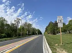 What is now MD 281 and its continuation in Delaware was the Old Post Road used to connect Christiana Bridge with the head of the Elk River, and by extension Philadelphia and Baltimore, in the 18th century.[3] Alternatively known as Old Baltimore Pike, this road was part of the Washington–Rochambeau Revolutionary Route used by the French army in September 1781 during their march from Newport, Rhode Island, to Yorktown, Virginia, during the Revolutionary War.[4] In 1817, the Elk and Christiana Turnpike was completed along the path of the Old Post Road; the turnpike operated until 1838, when Old Baltimore Pike reverted to a public road.[3] By the 1920s, the Old Baltimore Pike was supplanted by a parallel highway to the south from Elkton to Wilmington that was chosen as the route of US 40.[5] The first segment of the modern MD 281 was constructed as a macadam road east from US 40 (now MD 7) on Main Street to Big Elk Creek between 1930 and 1933.[6][7] In 1948, the Maryland State Roads Commission, which at the time maintained the major county highways in Cecil County, reconstructed much of Red Hill Road as a gravel road in 1948 before it was to be given a hard surface.[8] The 1.77 miles (2.85 km) of highway from the west end of the Big Elk Creek bridge along Red Hill Road to the state line was transferred from county to state maintenance through a May 8, 1958, road transfer agreement.[9] MD 281 was reconstructed from Big Elk Creek to the state line in 1960 and 1961; this work included a new four-span, steel beam bridge across Big Elk Creek.[10] The highway was resurfaced with bituminous concrete from MD 7 to Big Elk Creek in 1968 and from the creek to Delaware in 1973.[11] In 2017, construction took place on a $3.1 million project to build a roundabout at Muddy Lane/Kemp Lane; this roundabout opened to traffic in October of that year.[12]