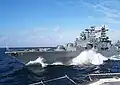 On 7 June 2019, Admiral Vinogradov came close to colliding with USS Chancellorsville. Each side blamed the other for the near collision.[6] Russian sources stated that the incident occurred in the southeast of the East China Sea while US sources named the location as in the Philippine Sea.[6] The Russian Navy claimed that the US ship made an unsafe maneuver, with Admiral Vinogradov forced to change course in order to avoid a collision.[7] The Russian military also claimed to have sent a protest to the US Navy. However, according to retired US Navy captain Carl Schuster, the Russian ship's wake shows that it "didn't adhere to either the rules of the road or the incidents at sea agreement."[8] United States Seventh Fleet spokesman Commander Clayton Doss said the Russian destroyer came within 50 to 100 feet (15 to 30 m) of USS Chancellorsville, "putting the safety of her crew and ship at risk." As of 2020, Admiral Vinogradov entered refit to upgrade to the standard of her sister ship, Marshal Shaposhnikov.[9] She is expected to return to service in 2024–2025.[10][11]