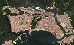 São Vicente Island (São Paulo, Brazil) (Ilha de São Vicente) is an island in São Paulo state, Brazil. It has an area of 57.4 km2 and a population of 760,000 people. The population density is 13,240/ km2, making it the most densely populated island in Brazil, and the 38th most densely populated island in the world. Parts of the cities of São Vicente and Santos are located on the island. The former sugar cane facility, Engenho dos Erasmos is situated here. Like the next island over, Guarujá (municip and island), São Vicente Island faces the ocean on one side, with freshwater rivers surrounding it.