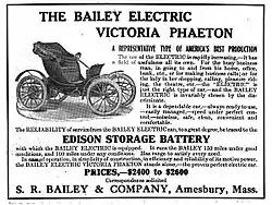 The company, based in Amesbury, Massachusetts, originally manufactured car bodies. Amesbury was a major center of car body manufacturers prior to the Great Depression. In 1907, S.R. Bailey began the production of automobiles. The brand name was Bailey, sometimes with the addition of Electric. 1916 was the last year of production, when the enterprise went into bankruptcy. Assets were purchased by Biddle and Smart, manufacturer of automobile bodies, in 1917.[1]