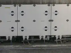 The SCMaglev system uses an electrodynamic suspension (EDS) system. The train's bogies have superconducting magnets installed, and the guideways contain two sets of metal coils. The current levitation system uses a series of coils wound into a "figure 8" along both walls of the guideway. These coils are cross-connected underneath the track.[3]