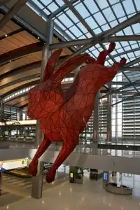 The Terminal A Parking Garage opened on September 23, 2004. The six-story structure had covered parking, a short walk to the terminal and public art ("Flying Gardens" by Dennis Oppenheim) installed outside the garage,[18] and "Flying Carpet" by Seyed Alavi, installed in the connecting walkway.[14][19]