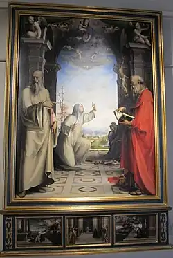 The first masterpiece of the artist's maturity, it was originally in the now-destroyed Olivetan monastery outside the Porta Tufi. It is dated on stylistic grounds. The predella was removed around the time of Della Valle before being recovered in the Padre Generale's apartments. The whole work was restored by the Florentine Gagliardi in 1830.[1]