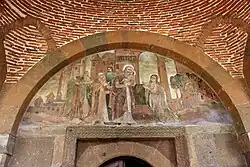 An airy, triple-arched portico was added to the western façade of the church in 1683 as the burial place for prominent Armenian clergymen. The gallery is made up of five distinct yet continuous bays, each being open and linked to the one adjacent. Its three central bays have vaulted ceilings and large arched openings that lead to the exterior courtyard. The two side bays are slightly lower in height and are vaulted as well. Each is surrounded by walls at three sides with small quatrefoil windows placed on the exterior walls. Frescos of clergymen adorn niches along the interior walls of the portico while saints are depicted on the fresco of the tympanum above the main door. Six-columned cupolas sit on the roof above the two end bays and may be seen from the exterior.