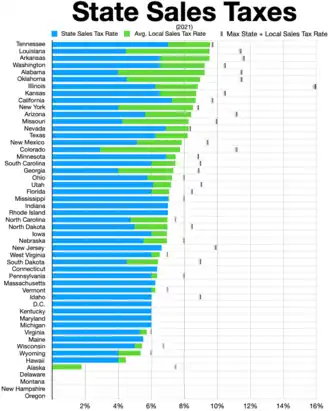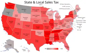 As of 2017, 5 states (Alaska, Delaware, Montana, New Hampshire and Oregon) do not levy a statewide sales tax.[1] Louisiana ranks as the state with the highest sales tax. Residents in some areas face a 12% sales tax[2][3]