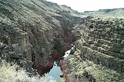 Salmon Falls Creek is a tributary of the Snake River, flowing from northern Nevada into Idaho in the United States. Formed in high mountains at the northern edge of the Great Basin, Salmon Falls Creek flows northwards 121 miles (195 km),[3] draining an arid and mountainous basin of 2,103 square miles (5,450 km2). The Salmon Falls Creek valley served as a trade route between the Native American groups of the Snake River Plain and Great Basin. Today, most of its water is used for irrigation.