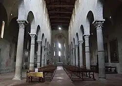 The interior was much changed over the centuries, but a restoration held in 1951-1961 brought it to the original appearance. In the apse was found a Christ in Majesty between Saints and Angels from the late 13th century, attributed to Manfredino d'Alberto. The pulpit sculpted in the mid 13th century by Guido da Como was also restored. The wooden crucifix in the high altar is from an unknown sculptor with a style resembling that of Giovanni Pisano.