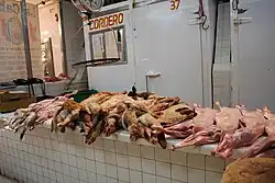 Many of the products here are from Europe, Asia and the rest of the Americas.[3] Of particular note is the wide variety of meat products found. Fresh meat from many different animals, both from Mexico and abroad can be found. These meats include those from iguanas, skunks, deer, rabbit, suckling pigs, goat, wild boar and lowland paca. One very unusual specialty is lion meat, from animals raised for those purpose in Zumpango and sells for about 850 pesos per kilo.[1][4] Fresh meats are from both Mexican and international sources, primarily Central America and the United States, with the most popular being rabbit, venison, wild boar and crocodile.[4] Poultry includes Cornish hens, duck, pigeon, goose, turkey, doves as well as the eggs from various types of birds. The market also has some of the finest seafood selections in the city, both Mexican and imported, including caviar that sells for more than 6,000 pesos a kilo.[1][2]