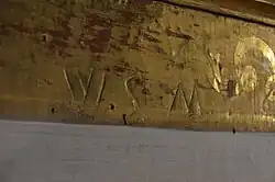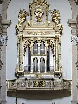 On the choir loft to the left of the chancel is a historic pipe organ of the Baroque type, built in 1716 by Giuseppe Bonatti,[35] an organ builder from Desenzano and a pupil of Carlo Prati.[36] It was played by the young Wolfgang Amadeus Mozart on January 7, 1770,[37] during one of his trips to Italy, and it seems that he used a penknife to engrave his initials W.G.M. on the case, which are still visible today.[38][39][40] In 1786 it was restored for the first time by Girolamo Zavarise, while Giuseppe Grigolli remodeled it in the second half of the 19th century.[38]